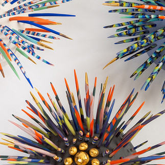 Δήμητρα Λεβέντη: Χρησιμοποιώντας ως αφετηρία μια παιδική ανάμνηση, πειραματίζεται με την πορσελάνη, δημιουργώντας ευφάνταστους, πολύχρωμους αχινούς.